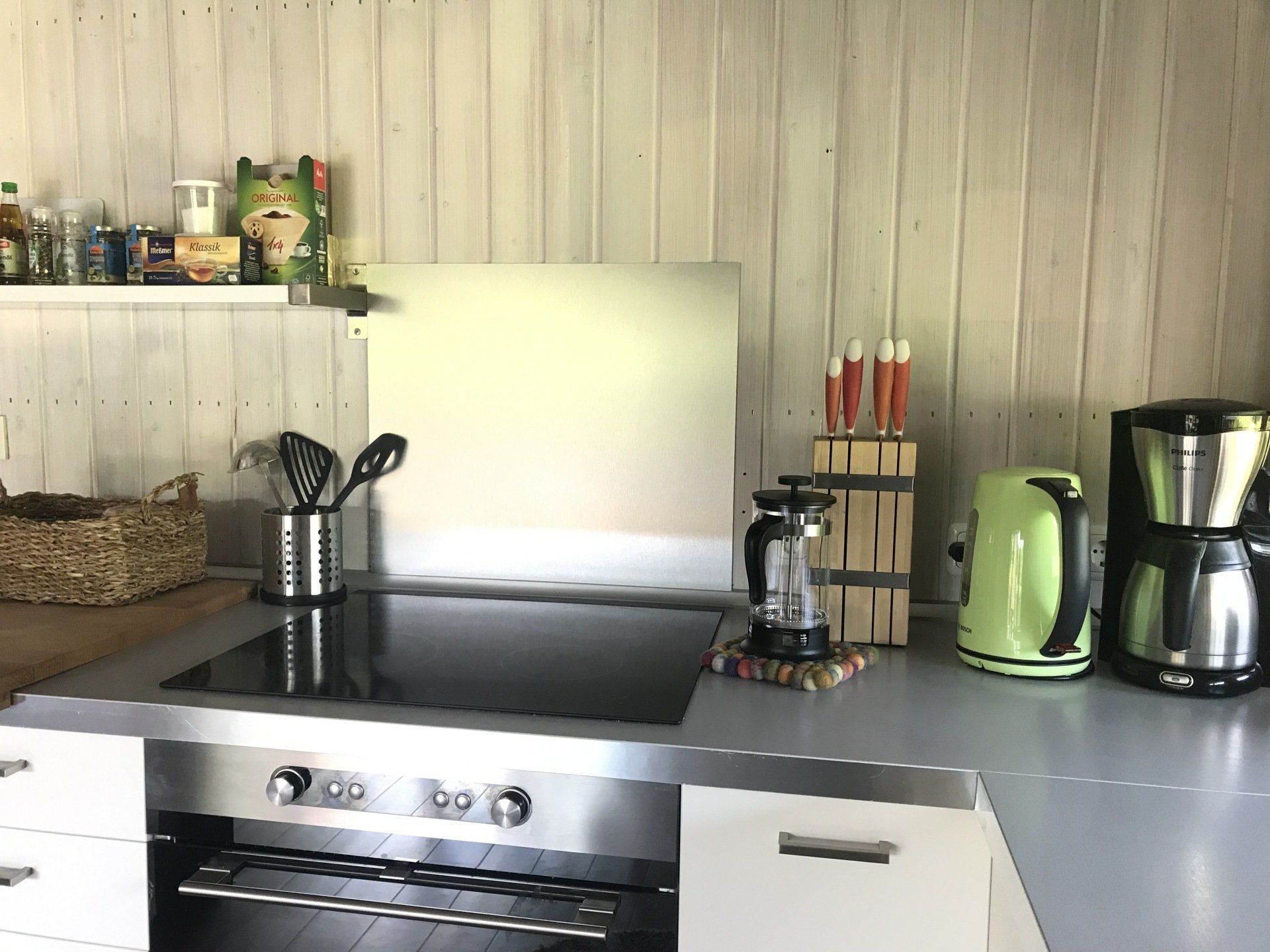 Die Küche ist ausgestattet mit Spülmaschine, Kühlschrank, einem Vier-Platten-Cerankochfeld sowie einem kombinierten Backofen/Mikrowelle. Eine Kaffeemaschine, ein Wasserkocher sowie eine kleine Sammlung Gewürze, Tee, Kaffee, etc. stehen für Sie bereit. Natürlich sind auch Geschirr, Gläser und Koch-utensilien in ausreichender Anzahl vorhanden.