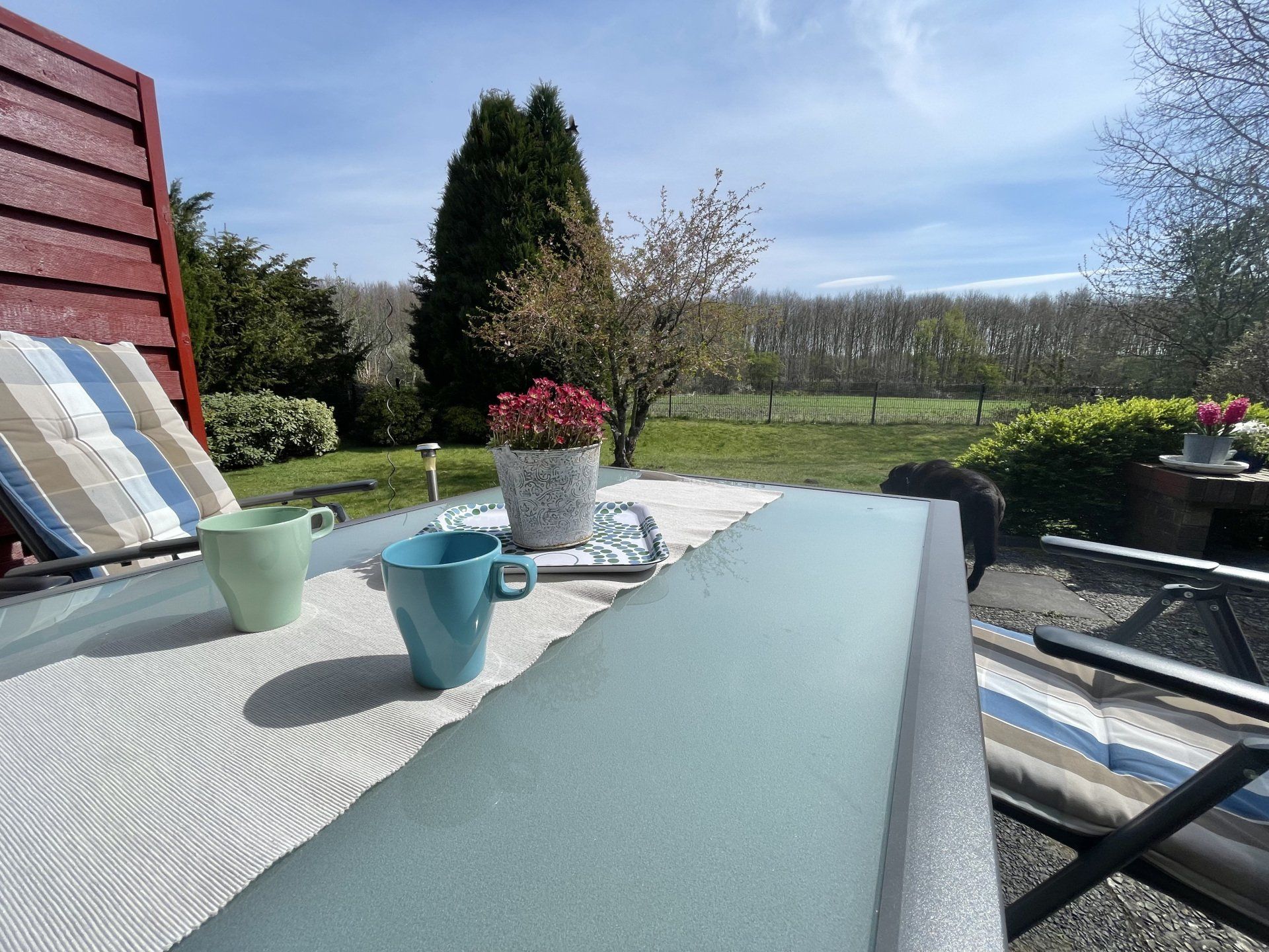 Der Garten ist komplett eingezäunt, so können Sie beruhigt Hund und Kind im Garten spielen lassen. Von der überdachten Terrasse mit Markise schauen Sie auf Garten, ein angrenzendes Feld und eine Baumreihe, hinter der der NOK verläuft. Im Sommer können Sie die Pötte hören, im Winter, wenn die Blätter gefallen sind, können Sie sie sogar sehen.